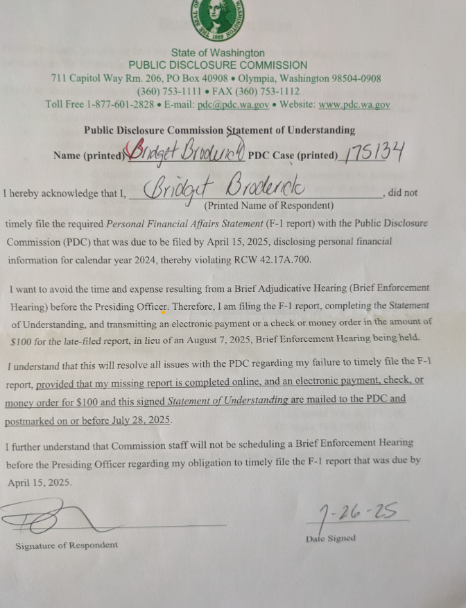 In accordance with RCW 42.17A.110 and RCW 42.17A.755, a Brief Adjudicative Proceeding (Brief Enforcement Hearing) has been scheduled to determine if you violated RCW 42.17A.700 by failing to file the required F-1 report for the 2025 election cycle. Under the Brief Enforcement Hearing rules, the Presiding Officer has the authority to assess a civil penalty in accordance with WAC 390-37-143, a penalty schedule adopted by the Commission (see enclosed copy).